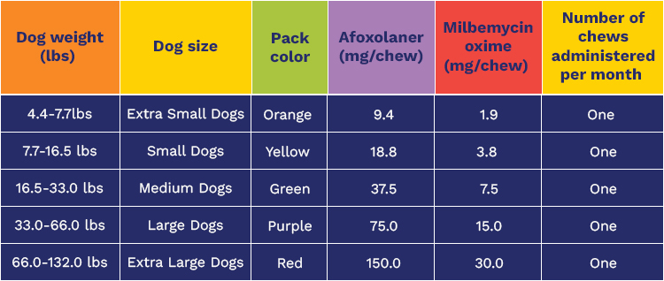 Nexgard Spectra is available in different packs according to dog’s size and weight, facilitating easy administration. Choose the one that best suits your dog: