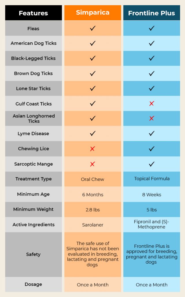 Let’s take a look at a detailed comparison of the key features of Simparica and Frontline Plus